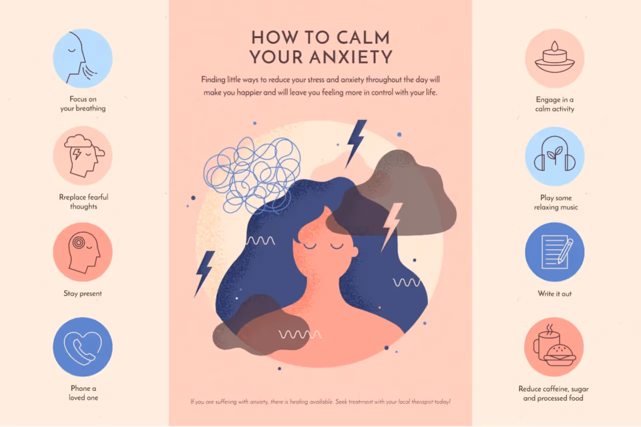 To reduce your anxiety, you can practice relaxation techniques such as deep breathing, progressive muscle relaxation, guided imagery, and mindfulness practices. Additionally, regular exercise has been found to be beneficial in managing stress and improving mental health.