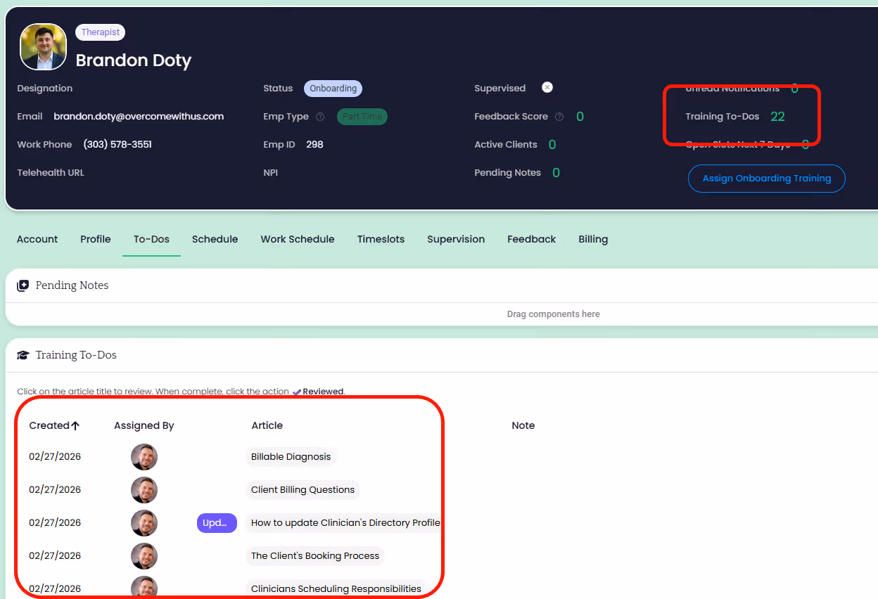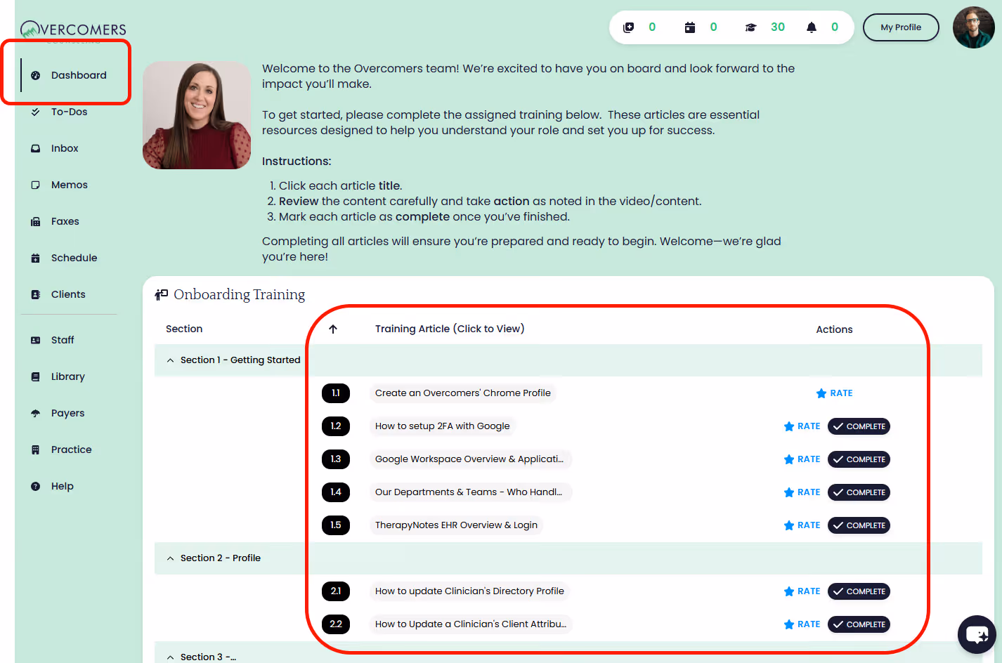 During onboarding, these articles appear as a dedicated list of to-dos on the staff member’s Dashboard (Home) page.