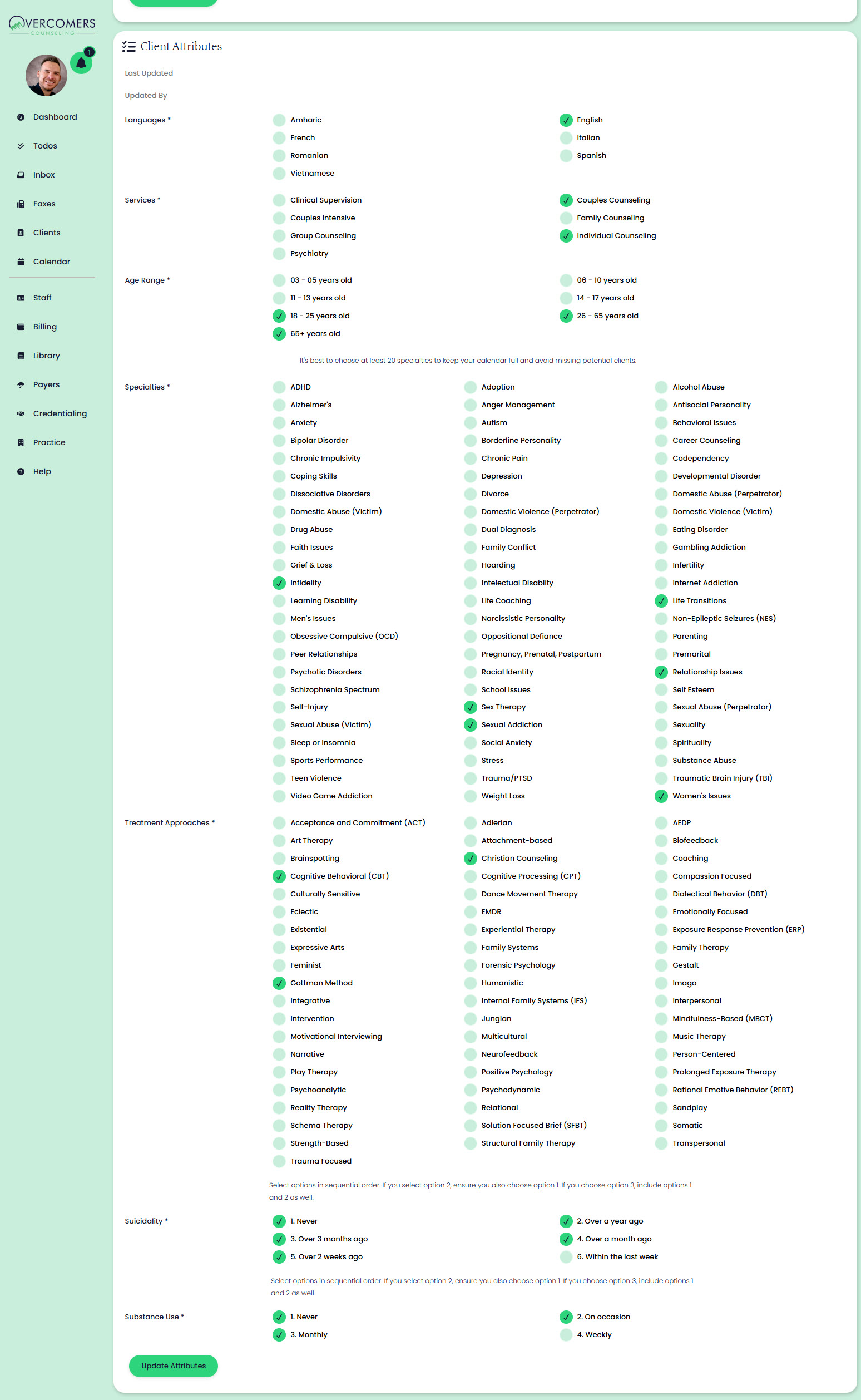 To update a clinician’s client attributes (specialties, services, treatment approaches, and more), go to the new EHR and navigate to Staff → Clinician Name → Profile. Scroll down to the Client Attributes section.