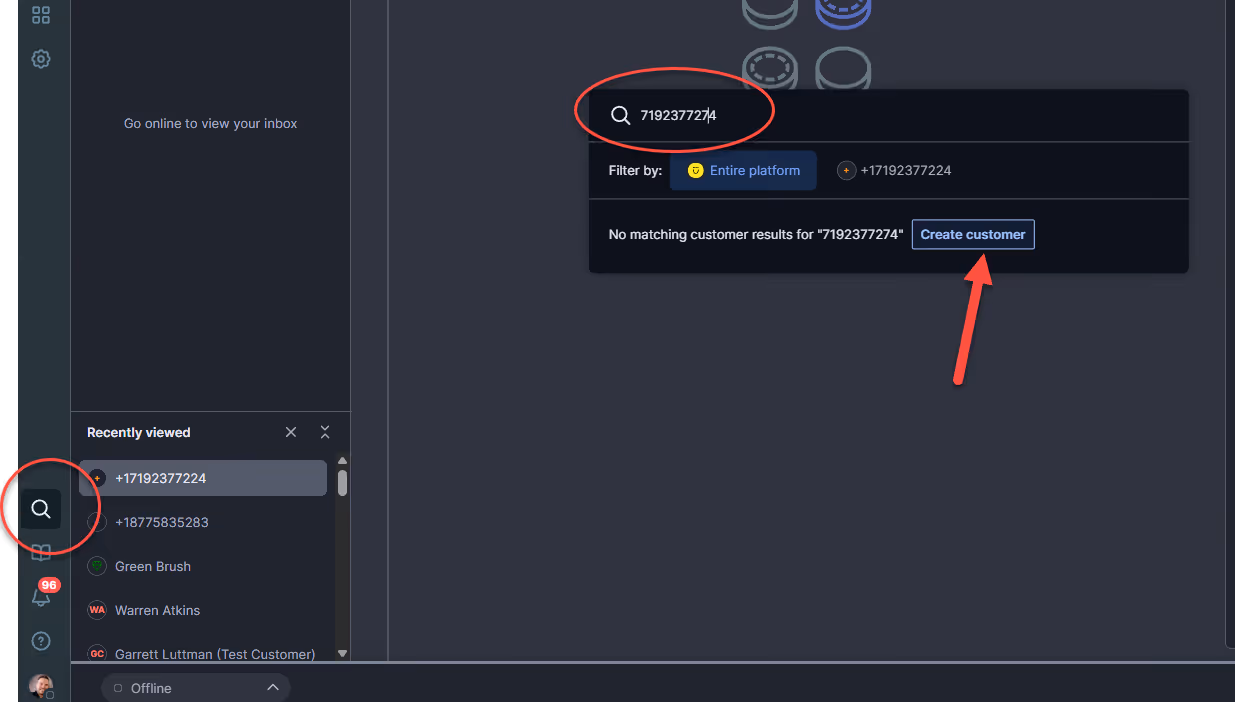 This tells clients that you are working on their issues and gives you time to find the best information. Best practice is to look up the client by phone number in Kustomer, and if a customer doesn't exist with that number, you can easily create a customer, right from the Search pop-up box.
