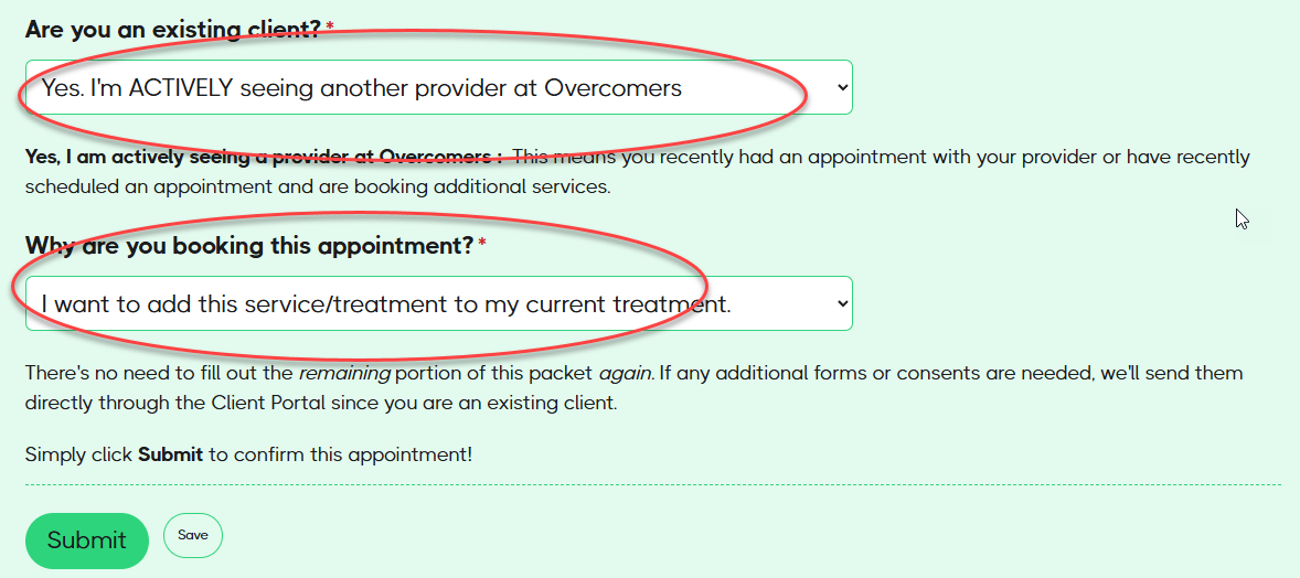 Upon submission, the Support Team will be notified to add the clinician and appointment to the client’s file.
