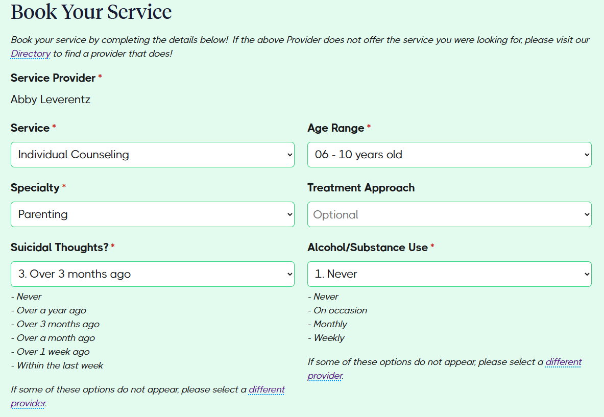 Visit the Directory and search for one of the available clinicians who match your client’s needs. Offer the time slots to your client, and if one works for them, click Book.
