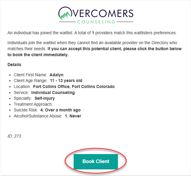 Each provider the user selects will be notified of the details about their needs. If you, as a matching provider, receive this email and determine that you can accommodate this client in your schedule, click the 'Book Client' button to schedule the appointment.