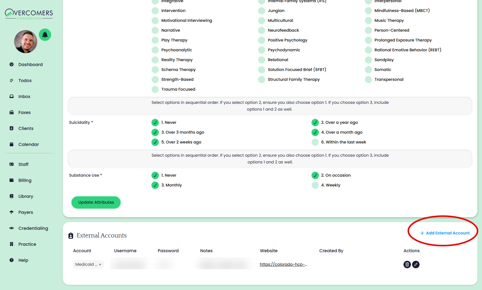 The clinician's CAQH must be access by Overcomers Credentialer, therefore the clinician must input the login username and password in Overcomers EHR. Go to Staff >> Your Name >> Profile tab and scroll to bottom to add your CAQH account details. External account details are only visible to Admin and Support Team.