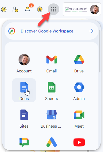 You are already logged into your OC Gmail when you created your OC Chrome Profile. Review how to create your OC Chrome Profile here: Overcomers' Chrome. You can access many of OC’s Google Workspace products by clicking the grid icon next to your profile pic.