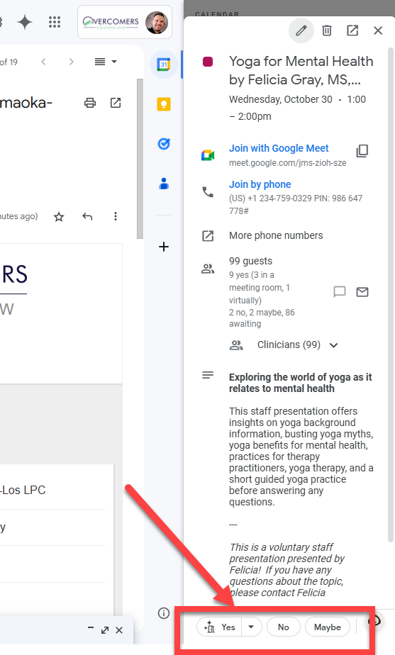 Here are two easy ways to respond to a meeting invite. Responding with "Yes" or "No" greatly benefits planning.