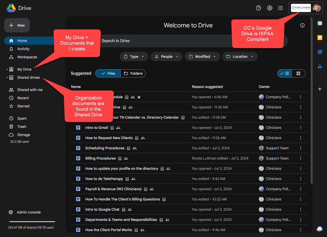 OC’s Google Drive contains all your client letters, documents, etc., and all our organization documents. More importantly, it’s HIPAA compliant. Google Drive allows users to store files on their servers, synchronize files across devices, and share files. Files created and edited through the office suite are saved in Google Drive.