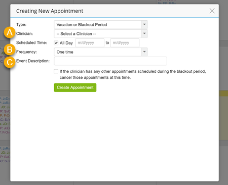 (A) Clinician: Select a single clinician. If you would like to cancel any conflicting appointments for this clinician, select the If the clinician has any other appointments scheduled during the blackout period, cancel those appointments at this time checkbox.