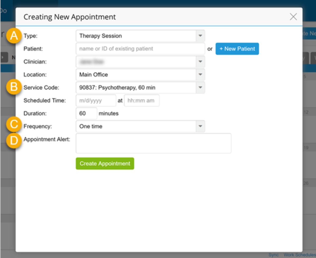 (A) Type: The selection in this dropdown determines 1) which Clinicians will be available to schedule the appointment with, 2) which service codes can be connected with the appointment, and 3) which note template will be available to the Clinician at the time of the appointment. For example, ini you select Therapy Intake, only Clinicians with a Psychotherapy type will be available from the Clinician dropdown, only service codes under the service type Therapy Intake will be available from the Service Code dropdown, and the Clinician will be prompted to complete a Psychotherapy Intake Note once the session has begun.