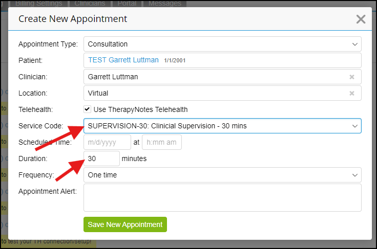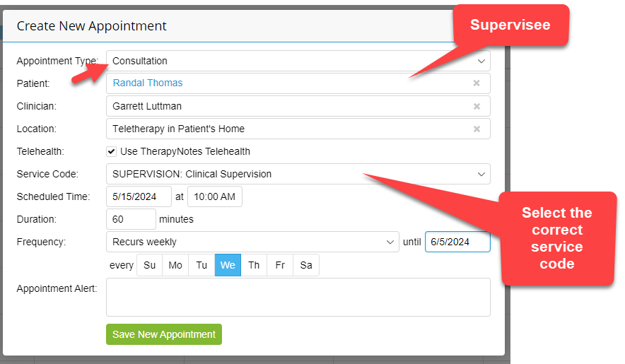 All supervision appointments will be scheduled within TherapyNotes. The supervisee will be set up the same way a client is. The supervisee will pay for their supervision session ($40) just as a client would pay - in the client portal. Of course, their fees will be waived if they take advantage of the free supervision options. If they are pursuing the 100+ session month, they can wait to pay, or not pay, their supervision session until the end of the month.