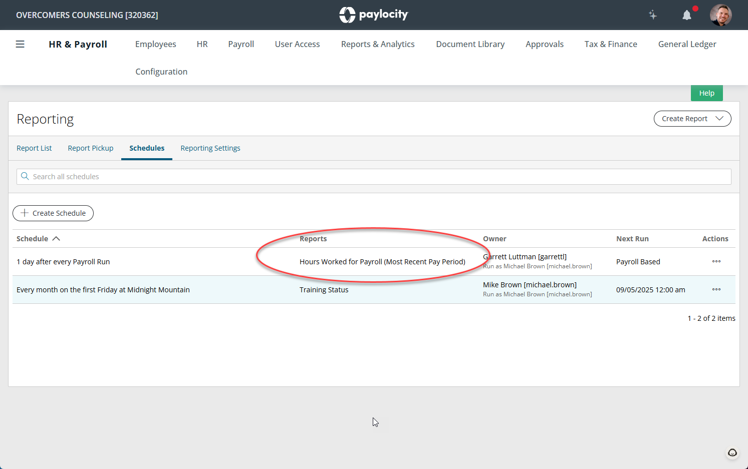 A report is scheduled to be delivered to Mike's email 1 day after payroll. The report is titled 'Hours Worked for Payroll (most recent pay period)'.