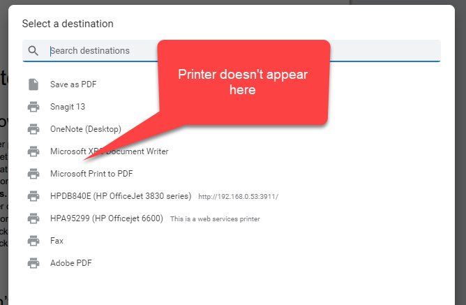 Open up a new “Incognito” tab and hit Ctrl+P to try and print and see if the printer is there.
