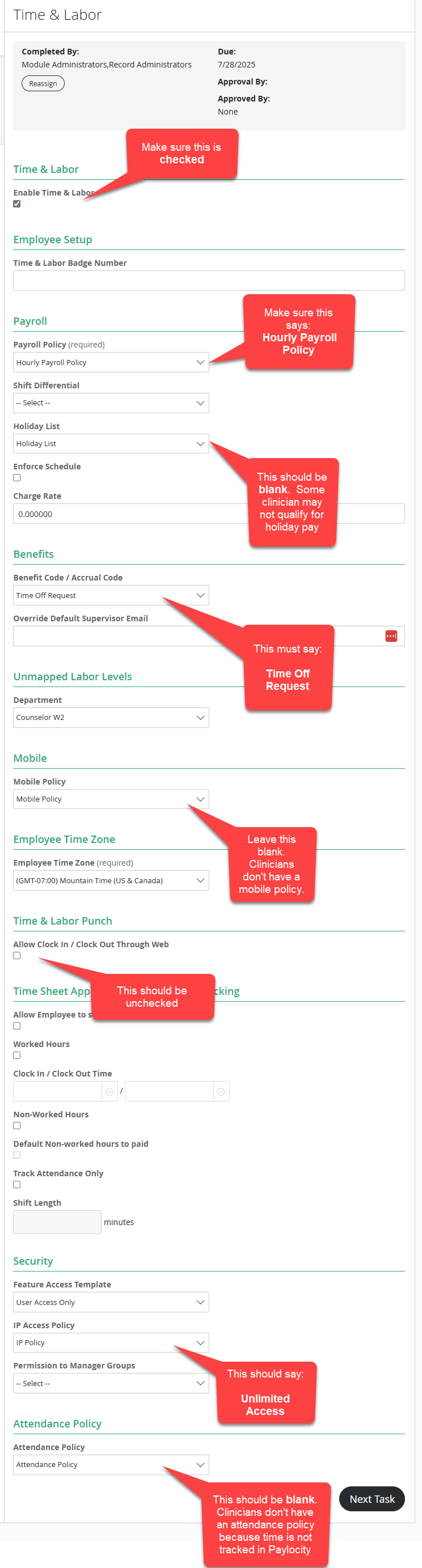 Review the screenshot to ensure the Time & Labor function is set up correctly for W2 Clinicians.