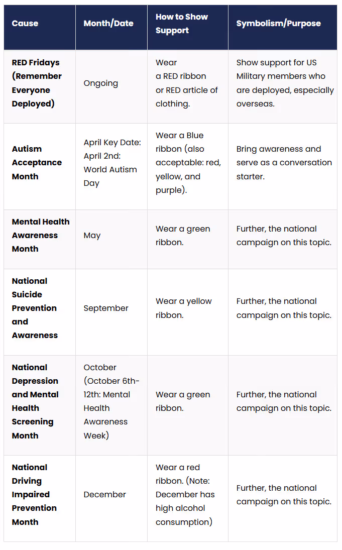 The following table details the Overcomers' causes, their associated ribbon colors, and how to show support: