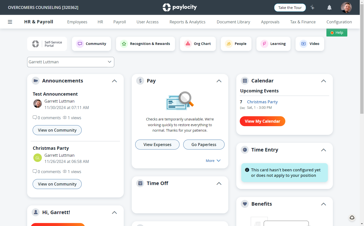 Once logged in, the main screen will be the Self-Service Portal, where you can access many features of this HR platform. Details on how and when to use these features will be provided within the application at a later date.