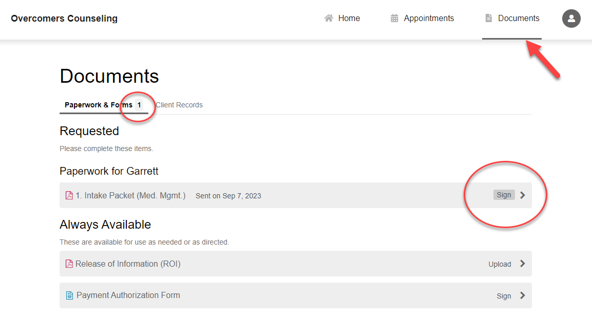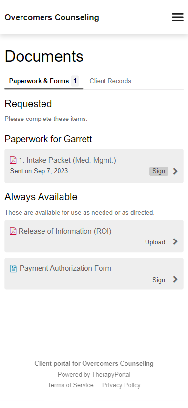 It is crucial to have your client complete all your document requests. A simple way to achieve this is by having the client log into the Client Portal at the beginning of each session. They can conveniently log in on their phone. If you are meeting in person, you can provide them with your Chromebook, or they can open a new tab in their browser to complete the documents during the TH session.