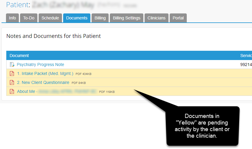 Sharing documents or sending assessments must be done through the Portal. You must follow up with the client to complete these documents/assessments or remove them from the portal if the client has no intention of completing them. For most documents/assessments, the clinician is responsible for 'processing' the document after completion. Ideally, all documents should be 'processed' within 2 to 7 days of receipt.