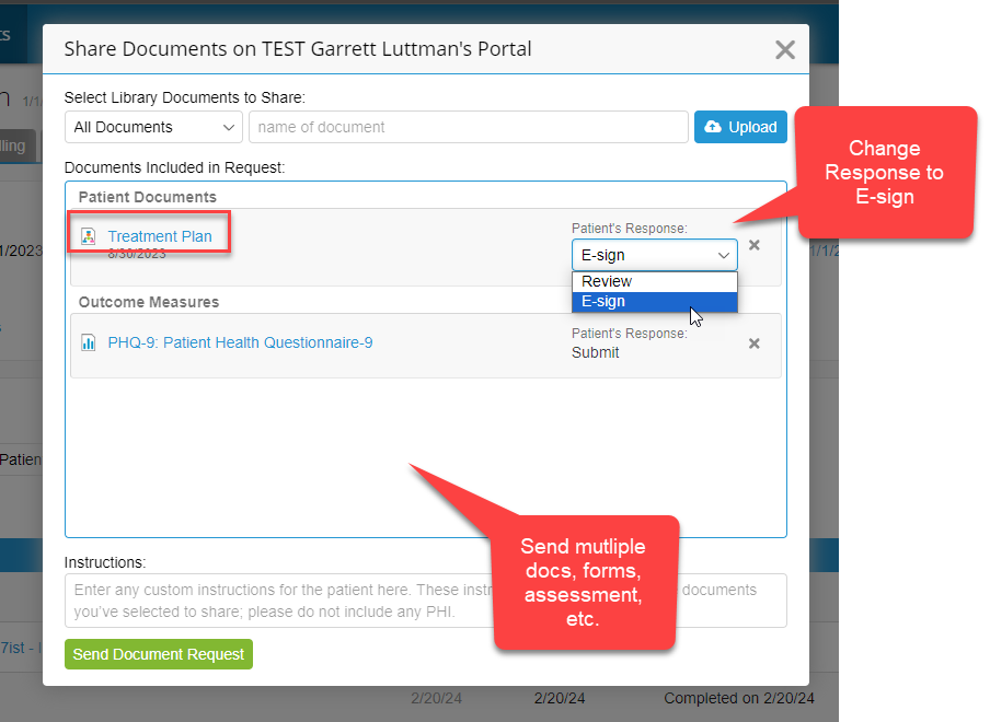 After you have added all your documents, be sure to set the patient’s response to Review, Upload or E-Sign: