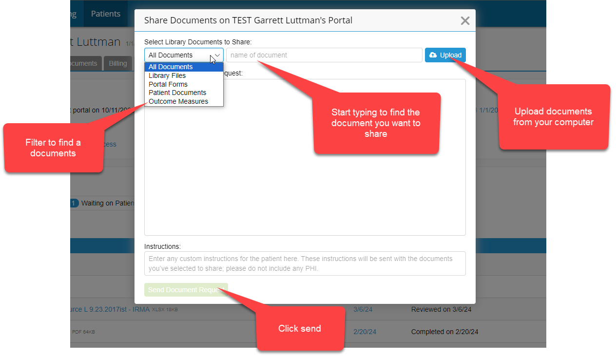 You can share Patient Documents, TN Library Files, Outcome Measures and/or upload documents from your computer: