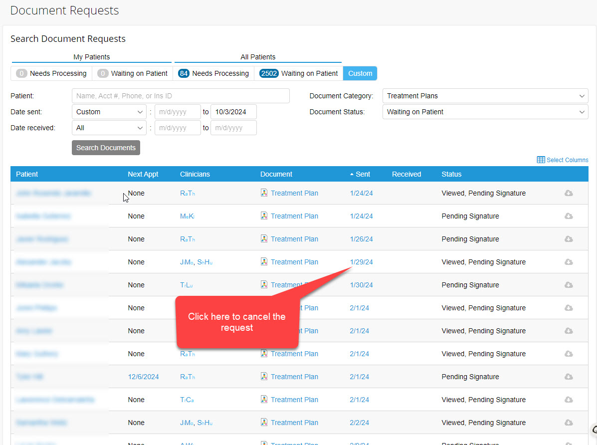 Take a moment to ensure that any pending portal documents for terminated clients are cleaned up to keep your files up-to-date and accurate. Review and cancel any docs under the 'waiting on patient' if the client has been terminated.