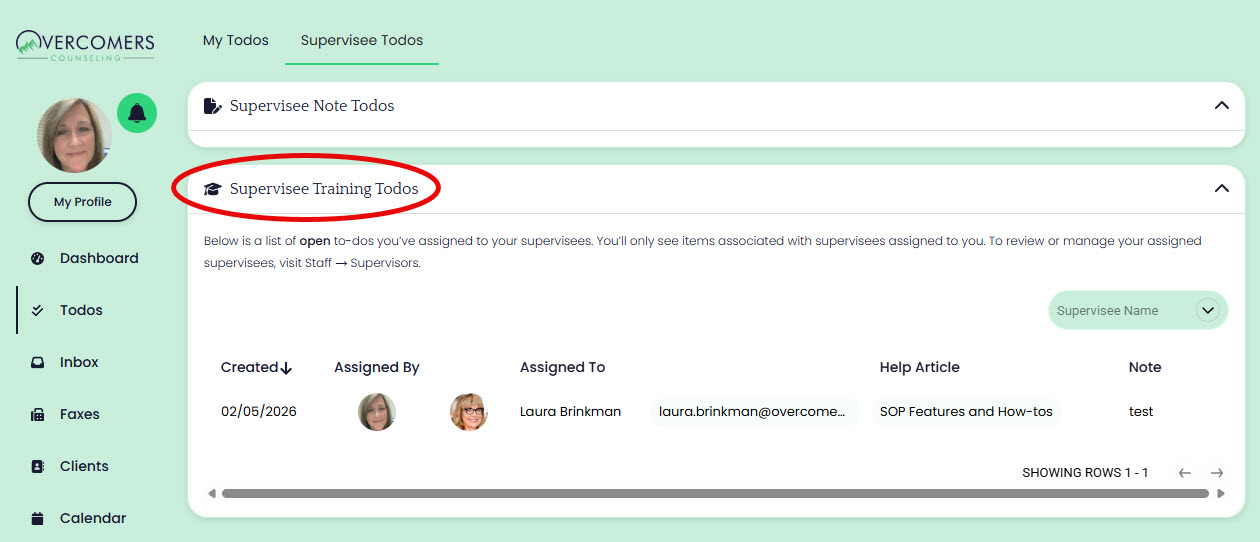Review the articles you've sent to your supervisees. Only the 'open' todos are visible.