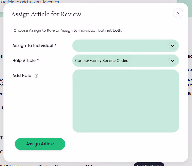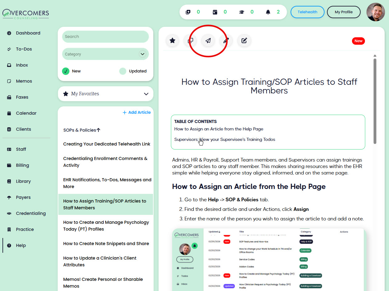 Admins, HR & Payroll, Support Team members, and Supervisors can assign trainings and SOP articles to any staff member. This makes sharing resources within the EHR simple while helping everyone stay aligned, informed, and on the same page.