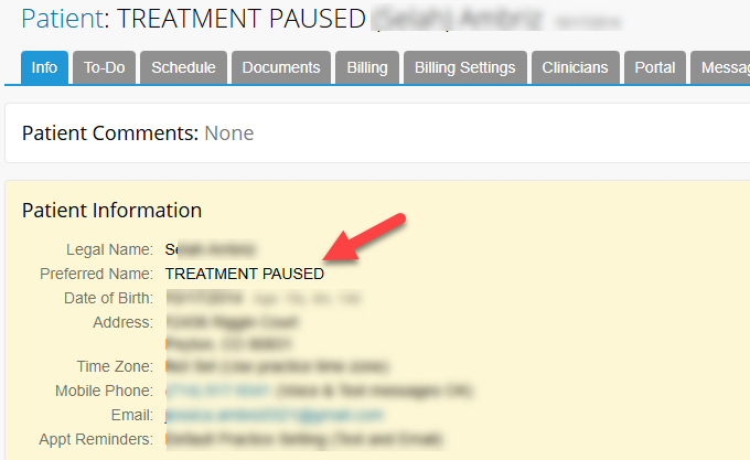 Treatment pauses help prevent the client from racking up a bill, which causes more financial hardship. They are called "pauses" because, ultimately, we would like the client to stay as a client and continue getting the support they need. Clinicians can help clients avoid treatment pauses by reminding them (or walking them through the process) to pay their copay during the sessions. This is especially true for telehealth sessions and sessions with minors. Get the parent involved to avoid the treatment pauses. The parent can put a card on file in the Client Portal so they don't have to be present at every session to pay the copay.