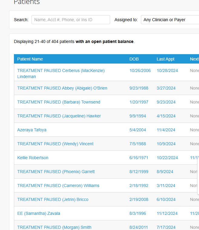 Go to Patients >> Any Clinician or Payer >> Have Open Patient Balance – Search.