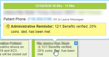Verification of Benefits usually takes place after the Intake Packet is received or during the Intake phone call. A snippet of what was determined from the client’s benefits can be found when you hover over the appointment.